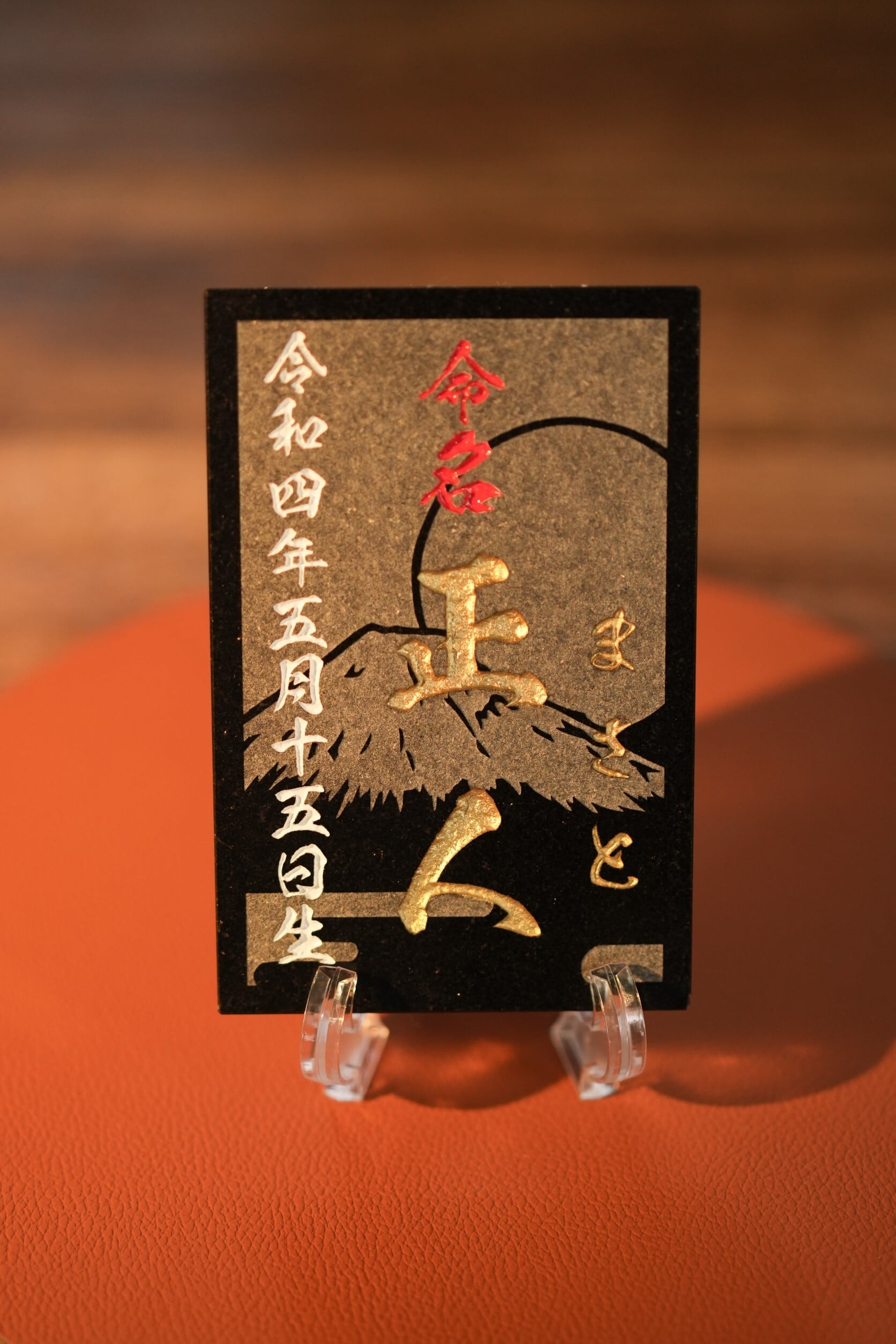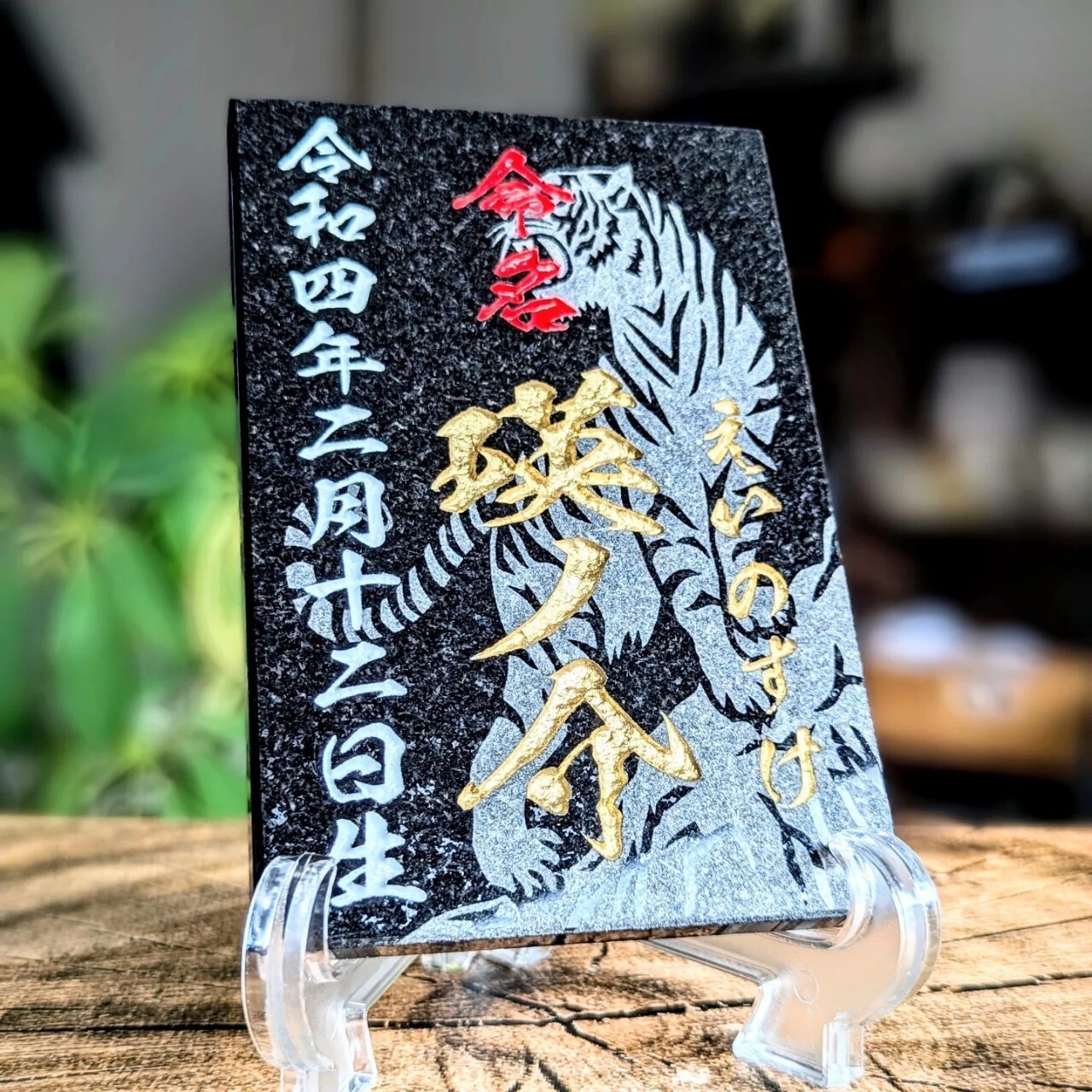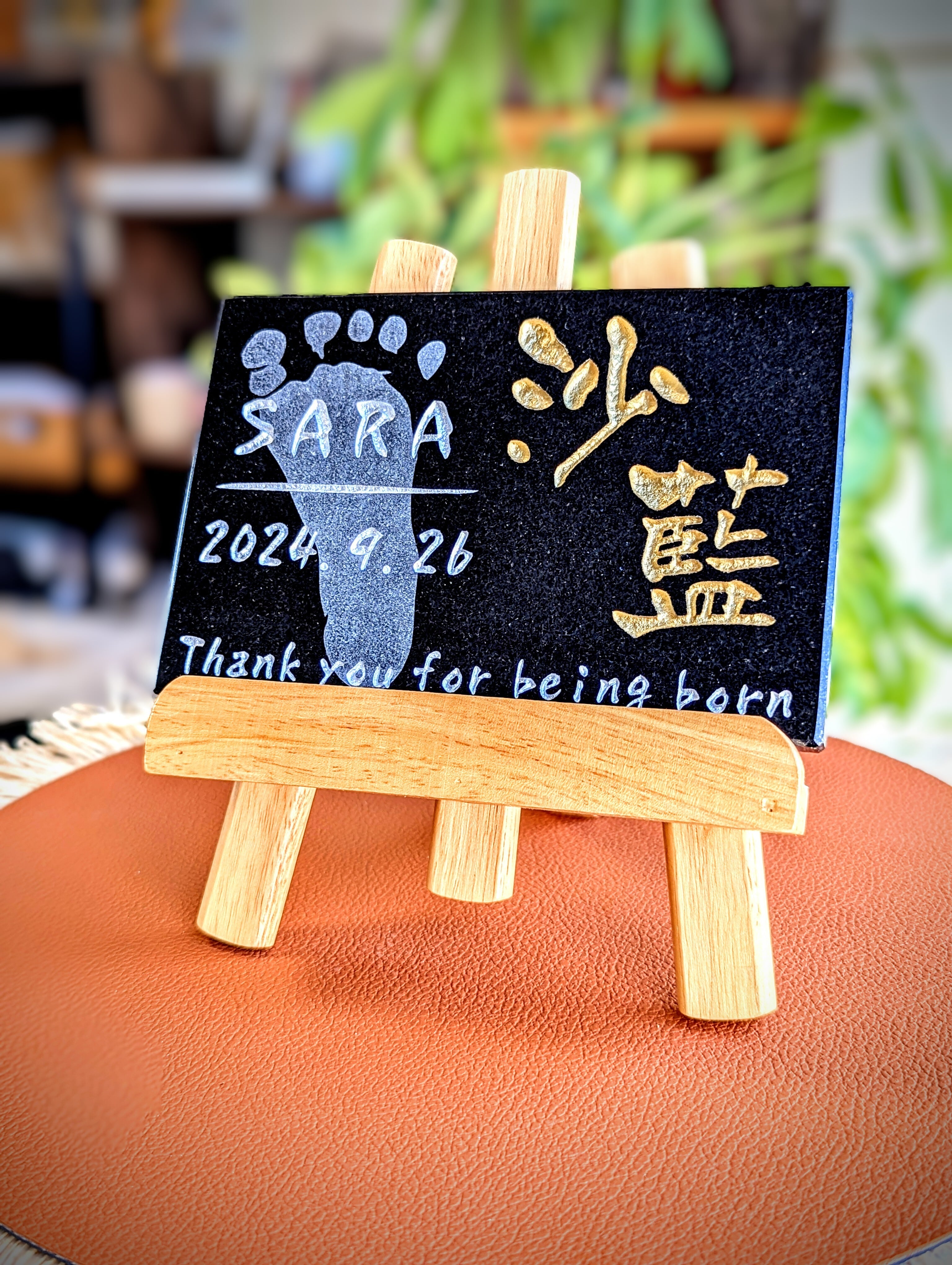 一般的な紙に書かれた命名書とは違い、高級感のある黒御影石に彫刻をした、一生の記念となる「つち屋工房」オリジナル命名プレートになります。