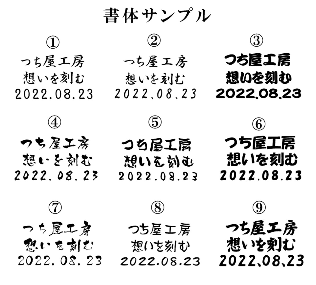 書体サンプル①~⑨の中からお好みのフォントと和風(縦型)か洋風を(洋風)お選び頂き、ショップのお問い合わせか[email protected]のメールアドレスまでご連絡下さい。その後お好みのイラスト等、彫刻内容のお打ち合わせをさせて頂きます。